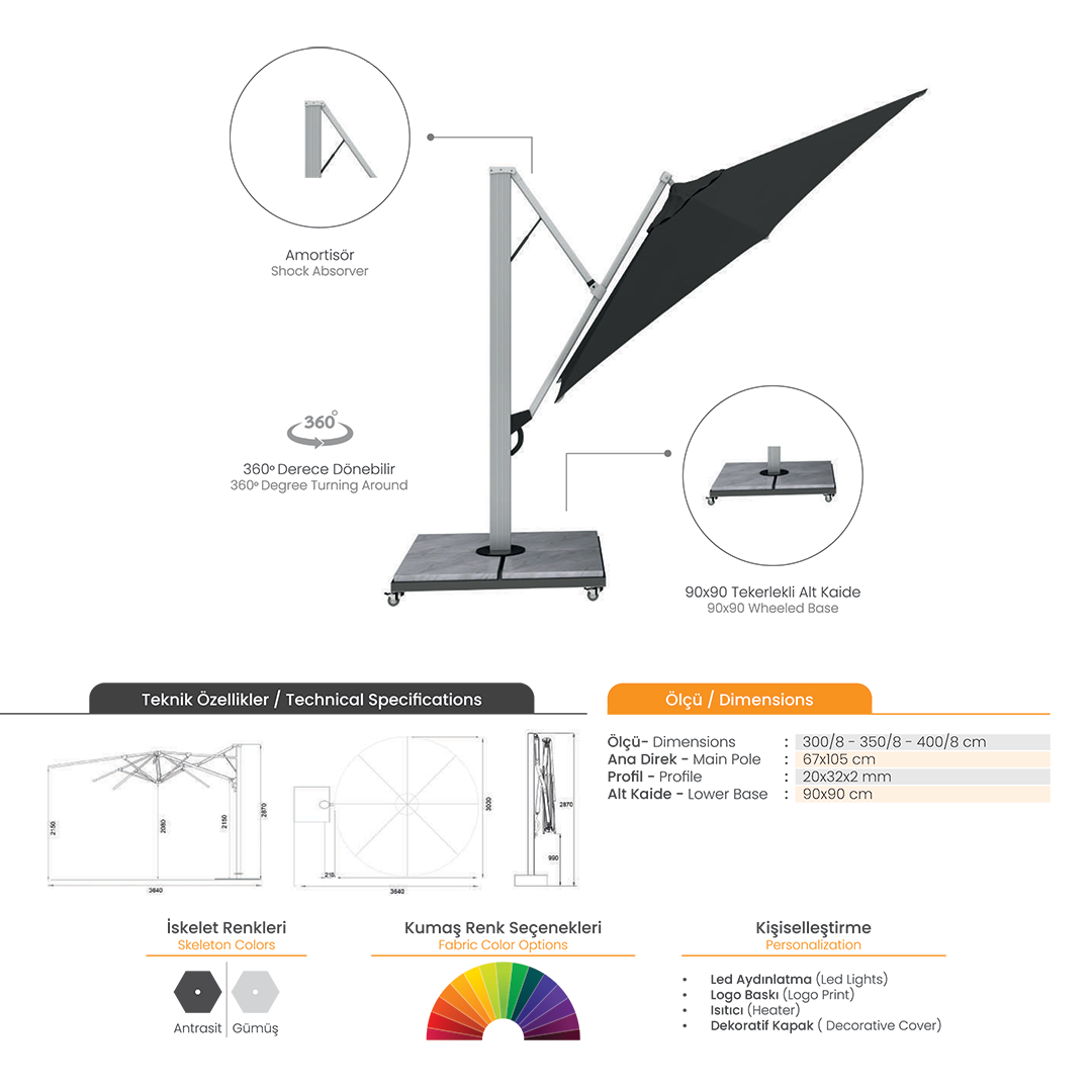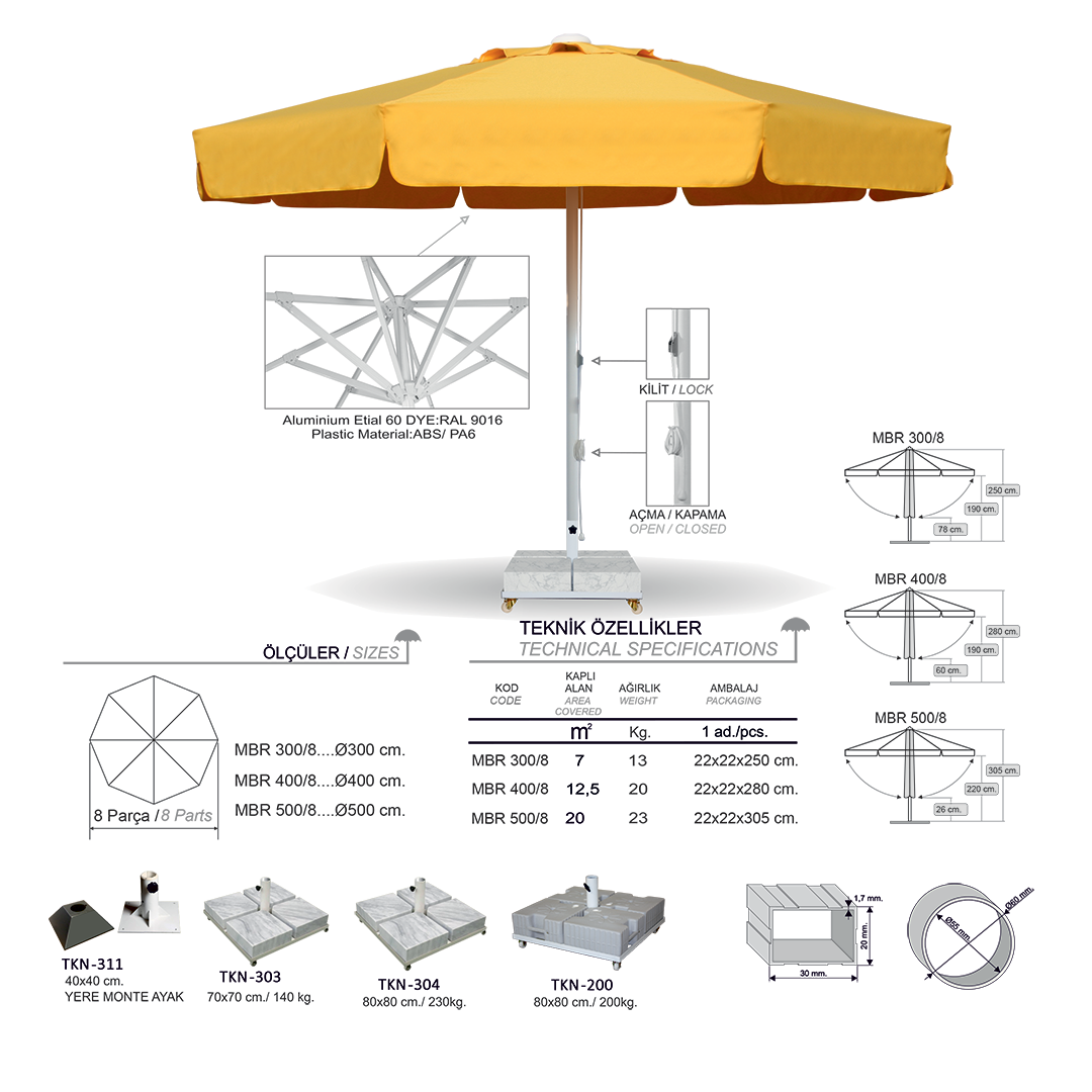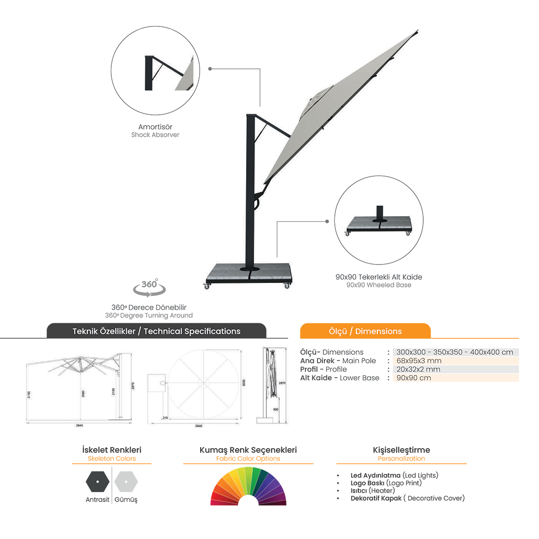 ✅ Şemsiye kolları: 20×32 mm federli alüminyum profiller