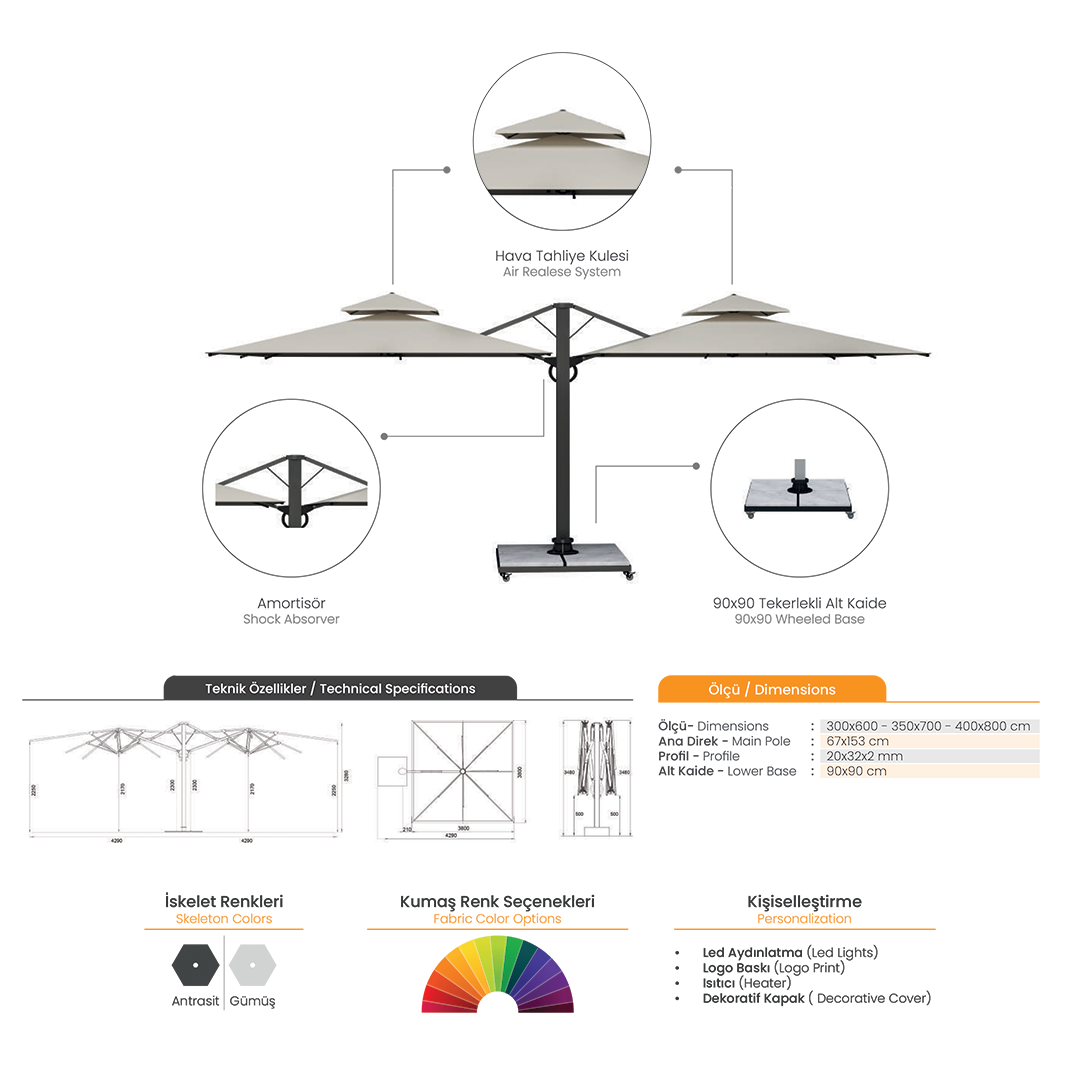 Dual T şemsiyemiz bahçe, kafe, restoran ve plaj gibi alanlarda maksimum gölgelenme sağlar.